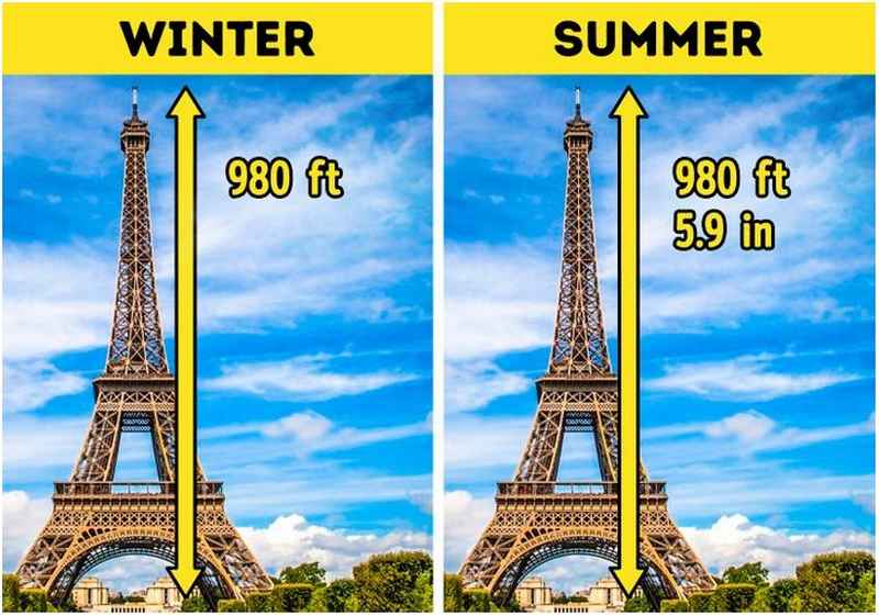 ഈഫൽ ടവർ പാരീസിലെ വളരെ പ്രശസ്തമായ ഒരു അടയാളമാണ്. വേനൽക്കാലത്ത്, ഈ പ്രശസ്തമായ ടവറിന് 15 സെന്റിമീറ്റർ വരെ ഉയരത്തിൽ വളരാൻ കഴിയും! ഇത് എങ്ങനെ സംഭവിക്കുന്നു? ഇത് സീസൺ അനുസരിച്ച് ഉയരം മാറുന്നു. ഇത് ഇരുമ്പ് കൊണ്ടാണ് നിർമ്മിച്ചിരിക്കുന്നത് എന്നതിനാൽ, വേനൽ സൂര്യനിൽ സമ്പർക്കം പുലർത്തുമ്പോൾ ടവറിന്റെ ലോഹം വികസിക്കുകയും ഘടന 6.75 ഇഞ്ച് വരെ ഉയരുകയും ചെയ്യുന്നു.